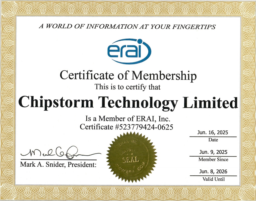 We are honored to announce that since June 2025, we have become a member of the Electronic Resellers Association International (ERAI),a trade organization whose vision is to make the global electronic supply chain a safe business environment through industry cooperation, education, data sharing and promotion of best business practices.